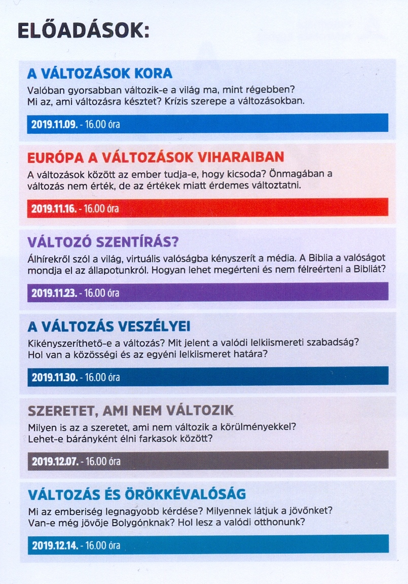 Minden alkalommal 18:00-tól szeretettel várjuk az érdeklődőket! Helyszín: Üllő, Közösségi Ház, Gyömrői út 24. A vetített képes előadások tartja: Bodnár János lelkész